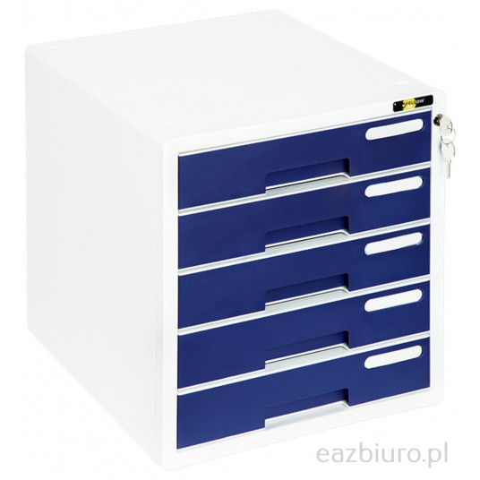 – plastikowa – zamykana na klucz: wszystkie szuflady – 5 szuflad A4 – okna opisowe – przydatna w realizacji przepisów RODO – wymiary 330x353x300 mm – granatowa