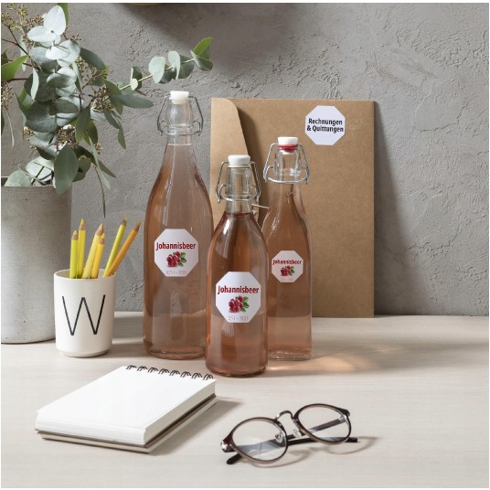 Usuwalne etykiety na przetwory - Białe, ośmiokątne etykiety samoprzylepne idealne do oznaczania np. słoików z przetworami, butelek z likierami i nalewkami, czy torebek z domowymi wypiekami itp. - Sprawdzają się także jako etykiety promocyjne, naklejki do czasowego oznaczania produktów oraz do dodawania nowych lub specyficznych informacji na opakowaniu. Są odpowiednie również do ogólnego oznaczania w biurze oraz w domu. - Niezawodnie przylegają do szkła, folii i papieru, ale jednocześnie są bardzo łatwe do usunięcia bez pozostałości śladów kleju. - Są przyjazne dla środowiska - posiadają certyfikat FSC®, czyli zostały wykonane z papieru pochodzącego z ekologicznie zarządzanych zasobów leśnych. - Etykiety przeznaczone do zadruku w zwykłych, domowych drukarkach atramentowych, laserowych, kolorowych laserowych oraz kopiarkach. - Bezpieczeństwo zadruku w drukarkach laserowych zostało przetestowane i zatwierdzone przez TUV. - Darmowe i ławe w użyciu szablony oraz oprogramowanie do projektowania i wydruku etykiet jest dostępne na stronie: www.avery-zweckform.pl - Ilość etykiet/arkusz: 24 - Ilość arkuszy: 10 - Ilość etykiet/opakowanie: 240