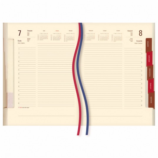 - Format: B5 - Układ kalendarium: 1 dzień - 1 strona + dodatkowe strony po zakończeniu miesiąca - Ilość stron: 384 - Druk: 2 kolory - Rodzaj papieru: offset 70g/m2, kremowy - Wkładka - miniatlas samochodowy Polski, - Wyklejka - mapa polityczna Europy - Oprawa - skóropodobna, wycięty register dwuprzebiegowy, dwie tasiemki, perforowane narożniki