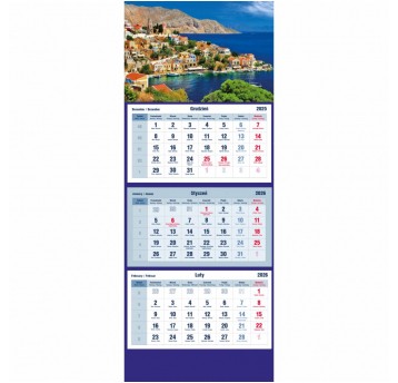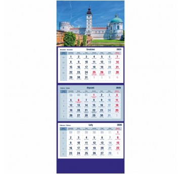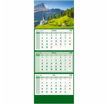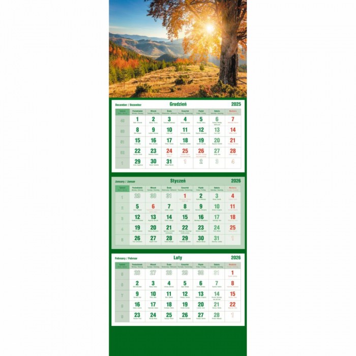 - Format: 315x855 mm - Rodzaj papieru: offset 80g/m2 biały - Układ kalendarium: 1 miesiąc - 1 kartka - Ilość stron: 12 - Druk: pełnokolorowy - Główka pełnokolorowa, okienko przesuwane, nazwy miesięcy i tygodni w wersjach językowych, miejsce na nadruk reklamowy