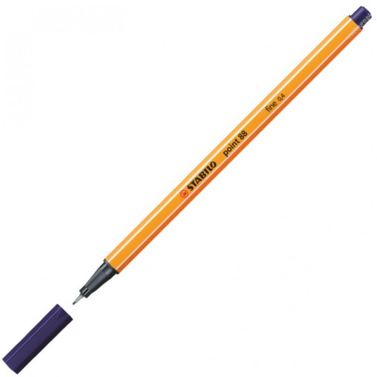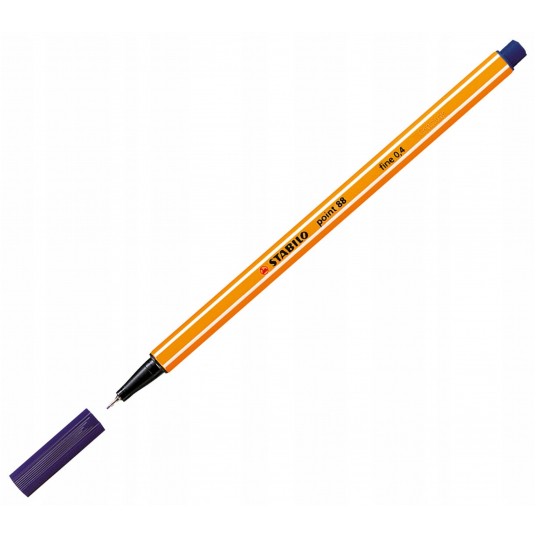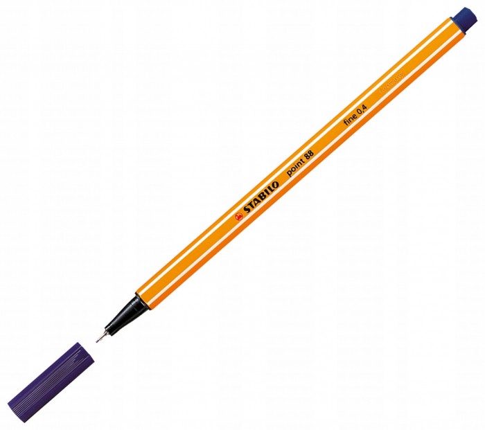 - STABILO point 88 to najpopularniejszy cienkopis w Europie. - Idealny do pisania, rysowania, podkreślania, kolorowania i pracy z linijką. - Dostępny jest aż w 47 kolorach, dzięki czemu nadaje się też do tworzenia map myśli i kolorowych notatek, które ułatwiają zapamiętywanie. - Mocna, oprawiona w metal końcówka jest odporna na złamania i rozwarstwienia, co gwarantuje wysoki komfort pisania aż do całkowitego wyczerpania tuszu. - Dodatkowe zalety to odporność na zasychanie (pozostawiony bez skuwki nie zasycha przez długi czas) i wentylowana skuwka co w przypadku jej nagłego połknięcia zabezpiecza przed uduszeniem. - Grubość linii pisania 0,4 mm. - Kolor błękit pruski.