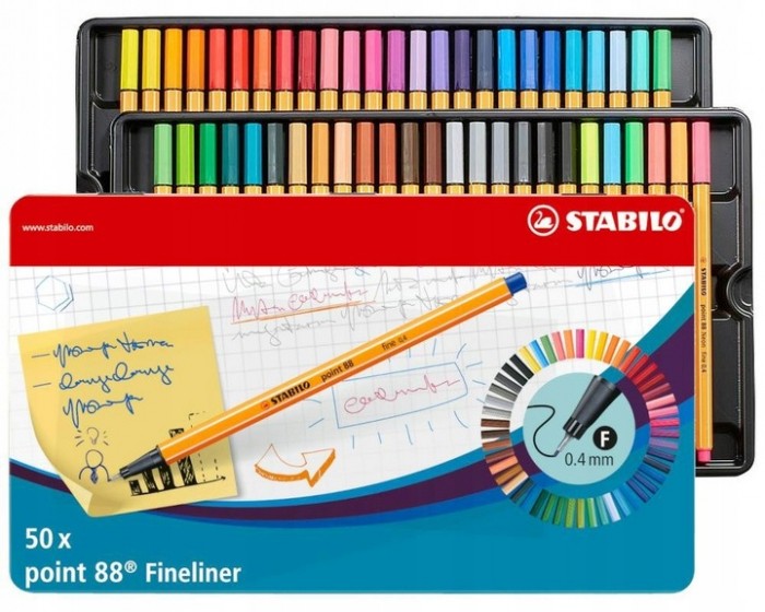 - Cienkopisy Point 88 marki STABILO to idealny kompan uczniów, studentów oraz osób pracujących - Niezaprzeczalny numer 1 w Polsce wśród cienkopisów - Niezawodny znak rozpoznawczy: jasne, podłużne paski na pomarańczowej obudowie - Pozwala na tworzenie skomplikowanych, misternych rysunków - Umożliwia pisanie bardzo drobnymi literami - Idealna do pisania pracy z linijką lub szablonem - Mocna, oprawiona w metal końcówka jest odporna na złamania i rozwarstwienia, co gwarantuje wysoki komfort pisania aż do całkowitego wyczerpania tuszu - Wentylowana skuwka umożliwia oddychanie w przypadku nagłego połknięcia - Dostępny aż w 55 kolorach - Grubość linii 0,4 mm - Metalowe etui zawierające 50 kolorów