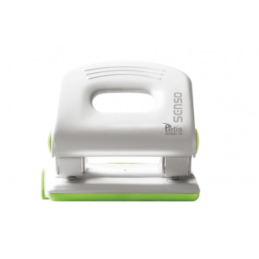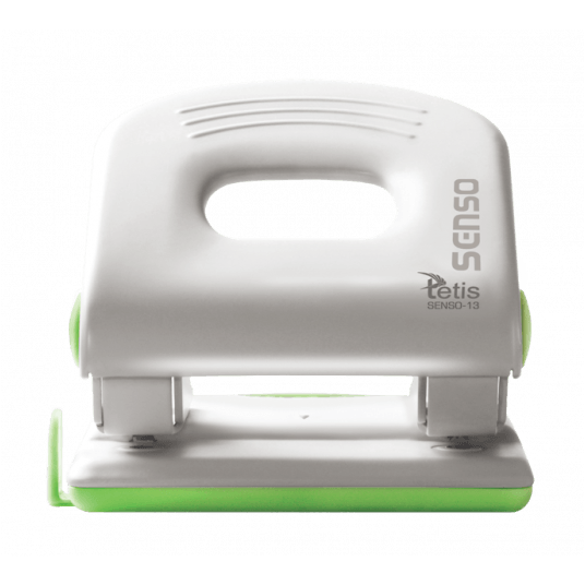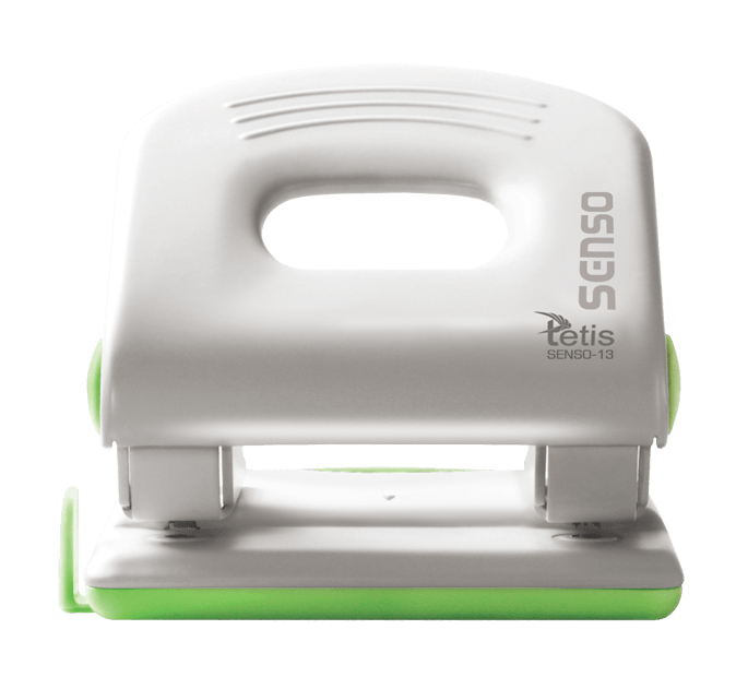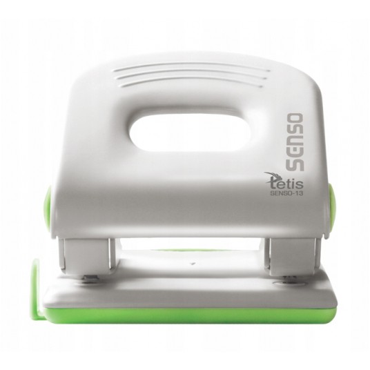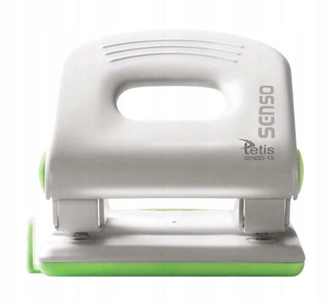 - Metalowy dziurkacz biurowy z wykończeniami z tworzywa sztucznego.
