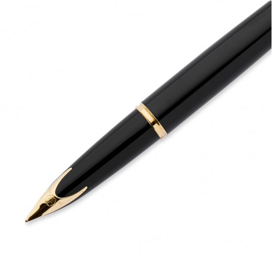 - Wyjątkowe połączenie błyszczącego czarnego lakieru z kontrastującymi, platerowanymi 23-karatowym złotem wykończeniami. - Wyposażone w stalówkę wykonaną z 18-karatowego złota zdobioną grawerem Waterman. - W opakowaniu znajduje się tłoczek Waterman - do napełniania atramentem w butelce. - Do pióra pasują także naboje atramentowe Waterman. - Typ stalówki: F - UWAGA: Nabój (kolor losowy niebieski lub czarny) do pióra umieszczony jest pod spodem dna pudełka.