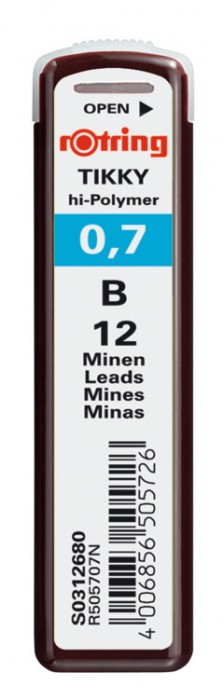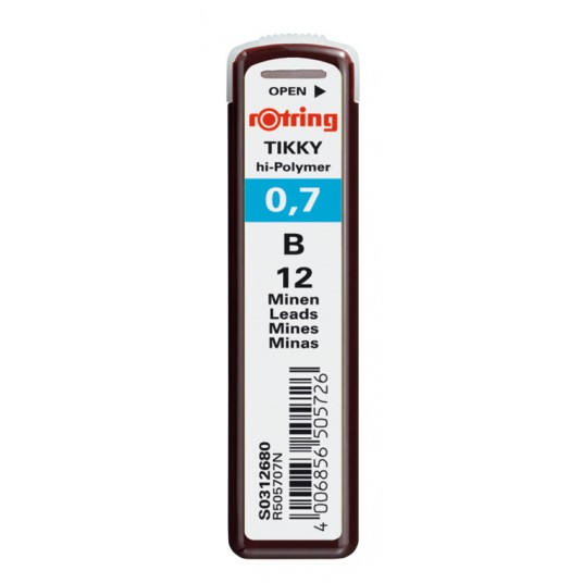- Rysiki, grafity firmy ROTRING TIKKY polecane są do pisma technicznego, rysunku i codziennego pisania, na papierze, kartonie i kalce. - Twardość rysika: B - Grubość linii pisania: 0.7 mm. - Wysokiej jakości grafitowe wkłady. - Odpowiednie dla wszystkich standardowych automatycznych ołówków. - Intensywne pełne czarne linie. - Łatwo wymazywalny ślad. - Praktyczne plastikowe opakowanie umożliwiające czystą wymianę grafitu dzięki nadstawce. - Przeznaczenie: papier, karton. - Jedno opakowanie zawiera 12 grafitów.