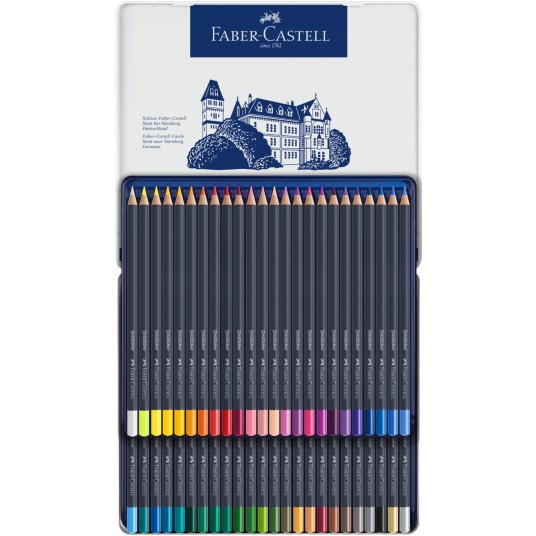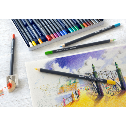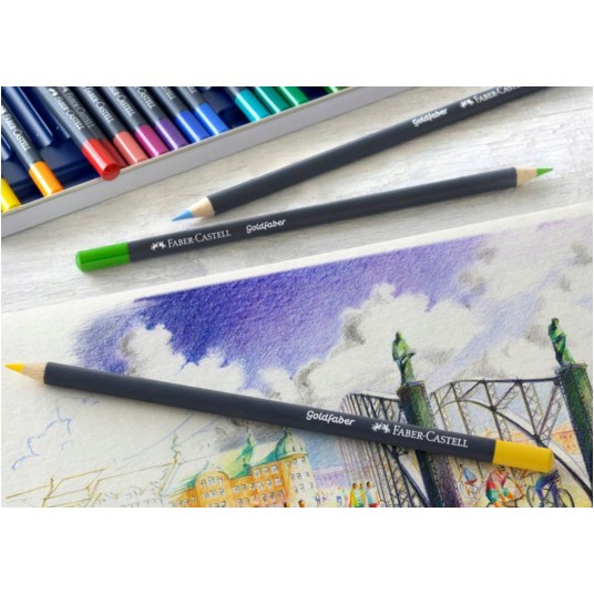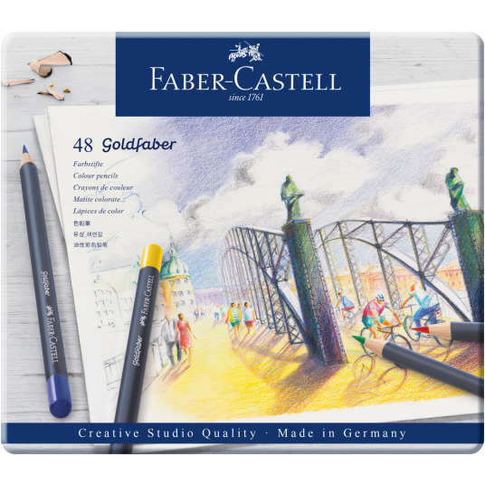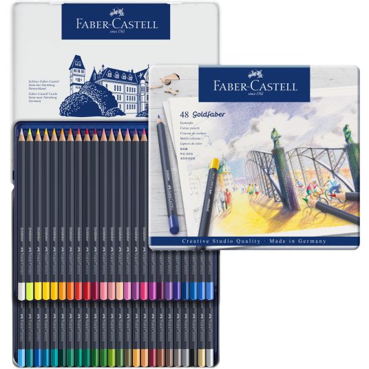- Kredki Goldfaber charakteryzują się wyjątkowo miękkim nakładaniem kolorów i zachwycają intensywnością kolorów. - Wysokiej jakości materiały oraz produkcja z wykorzystaniem najbardziej innowacyjnych technologii zapewnia maksymalną odporność na złamania, doskonałą światłoodporność, wyjątkową intensywność kolorów, wodoodporność, a także sprawia, że kredki nie kruszą się i nie pozostawiają niechcianych smug. - Szybkie szkice, cieniowanie, czy płynne tonowanie kolorów – wszystkie techniki rysowania mogą być osiągnięte bez wysiłku. - Grafit kredek Goldfaber dostosowuje się do różnych technik rysowania i poziomu umiejętności użytkownika. - Grafit 3.3 mm, wysoce napigmentowany. - Miękkie nakładanie kolorów. - Doskonała światłoodporność. - Wodoodporne, niekruszące się. - Wysoka odporność na złamania. - Dostępne w 48 kolorach. - Okrągły kształt. - Wyprodukowane w Niemczech. - Opakowanie metalowe 48 kolorów.