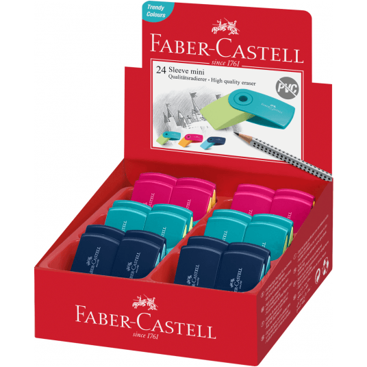 - Display naładowany gumkami Sleeve Mini FABER-CASTELL w 3 modnych kolorach. - Gumka o ergonomicznym kształcie zapewniająca przyjemne, miękkie ścieranie. - Plastikowa ruchoma osłona chroniąca przed zabrudzeniem. - Nie pozostawia smug. - Nie zawiera PVC. - Kolory w displayu: różowo-pomarańczowy, turkusowo-jasnozielony, niebiesko-jasnoniebieski.