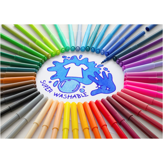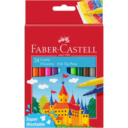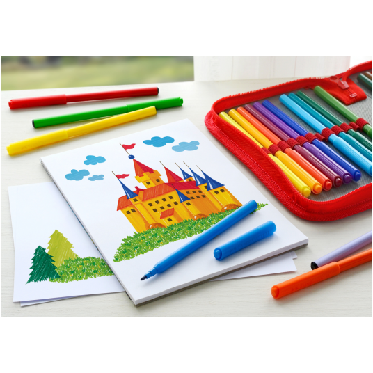 - Wysokiej jakości pisaki. - Tusz na bazie wody i barwników naturalnych. - Intensywne kolory. - Skuwka z wentylacją. - Spieralne z większości tkanin. - Opakowanie kartonowe, 24 szt.