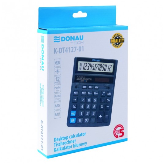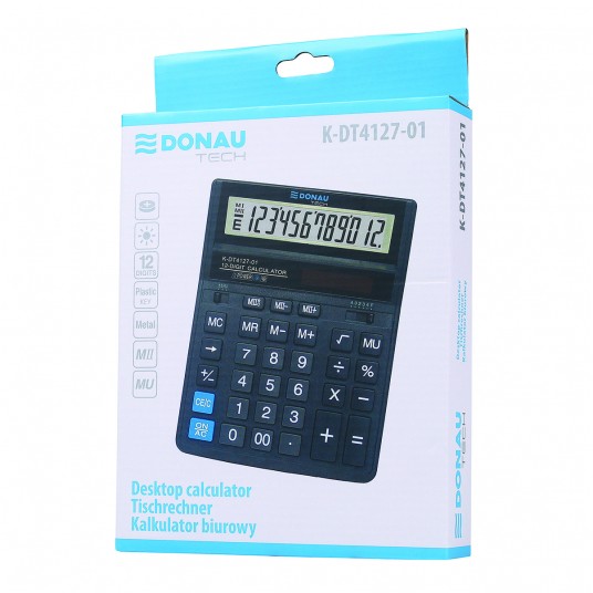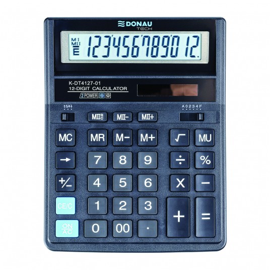 - Kalkulator biurowy z 12-cyfrowym wyświetlaczem z zasilaniem bateryjno-solarnym - Wymiar: 203 x 158 x 31 mm - Funkcja pierwiastka kwadratowego oraz obliczania procentów, obliczanie marży MU, podwójne zero, kasowanie ostatniej pozycji, pamięć, ustawienie dziesiętne, zaokrąglanie wyniku - Wyłącza się automatycznie - 5 lat gwarancji - Kolor: czarny