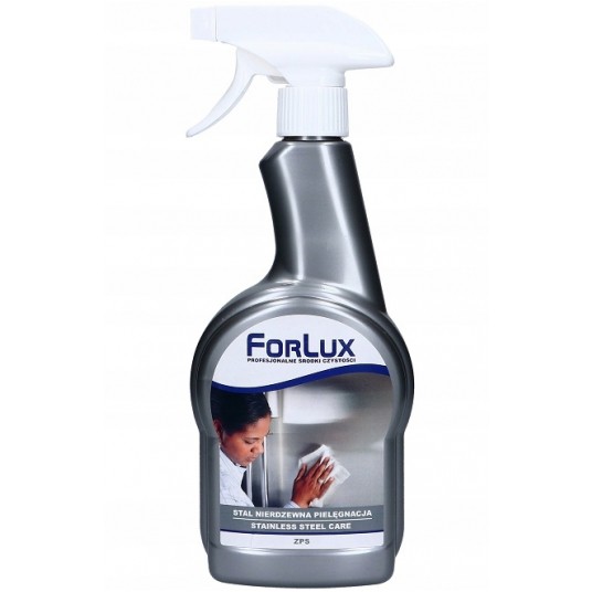 - Preparat Forlux ZPS 7 przeznaczony jest do mycia i konserwacji powierzchni wykonanych ze stali nierdzewnej lub innych metali. - Specjalny olej o właściwościach konserwujących tworzy na powierzchni metalu równomierną warstwę ochronną. - Chroniąca powłoka nabłyszcza powierzchnię metalu i zabezpiecza ją przed ponownym zabrudzeniem. - Po wykonaniu zabiegu nie pozostawia smug ani jakichkolwiek innych nalotów na czyszczonej powierzchni. - Przy użyciu preparatu Forlux ZPS 7 brud i zacieki usuwa się bez rysowania materiału. Preparat można stosować do mycia wind, poręczy, drzwi, dozowników, stołów , oraz wszelkiego rodzaju innych powierzchni wykonanych ze stali nierdzewnej. - Preparat posiada Świadectwo Jakości Zdrowotnej dopuszczające użycie go w pomieszczeniach i na powierzchniach mających kontakt z żywnością. H-HŻ-6071-0074/2017/A - Sposób użycia: Suchą powierzchnię spryskać środkiem Forlux ZPS i przepatrzeć suchą niestrzępiącą się ściereczką. W przypadku powierzchni silnie zabrudzonych zalecane jest ich wstępne umycie preparatem Forlux PG w stężeniu 25-50 ml na 0,5 l wody, po czym mytą powierzchnię należy przemyć czystą wodą. - Skład: Olej mineralny, olej silikonowy, olej parafinowy, środki pomocnicze, kompozycja zapachowa. - pH 7