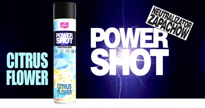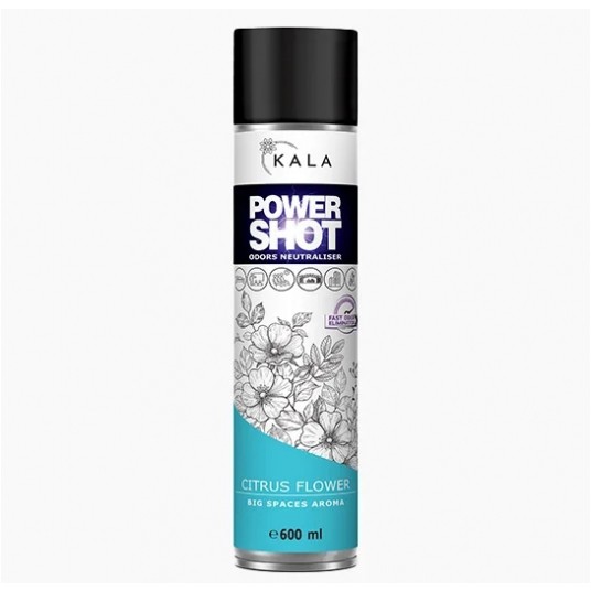 Neutralizator nieprzyjemnych zapachów, odświeżacz Kala POWER SHOT 600ml to produkt z rewolucyjnym sposobem dozowania, dzięki któremu jedno naciśnięcie wentyla (ok 1 sekunda) neutralizuje nieprzyjemne zapachy oraz aromatyzuje około 200 m3. W składzie POWER SHOT obecne są substancje czynne, dzięki którym nieprzyjemne zapachy są neutralizowane a nie jak w przypadku większości odświeżaczy przykrywane. Wraz z neutralizacją nieprzyjemnych zapachów POWER SHOT zapewnia również aromatyzację przestrzeni jednym z 6 dostępnych w gamie POWER SHOT zapachów.
