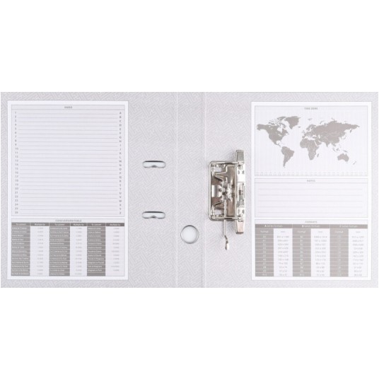 - Ekonomiczny segregator wykonany z kartonu o grubości 2,0mm i gramaturze 1200gsm, wyposażony w dolną listwę wzmacniającą - Pokryty matową folią polipropylenową (140µm) - Wewnątrz wyklejka papierowa z indeksem, tabelą formatów, mapą stref czasowych oraz miejscem na notatki - Dwustronna, wymienna etykieta grzbietowa w kratkę - Wzmocniony otwór na palec - Szerokość grzbietu: 75mm - Wymiary: 75x320x285mm - Kolor szary