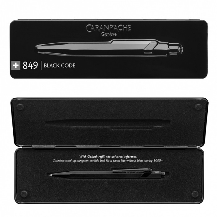 - Po sukcesie kolekcji 849 Original, Goldbar i Brut Rosé, nowy długopis 849 Black Code uzupełnia ofertę Gift Line marki Caran d’Ache - Genewska manufaktura zaprasza do ponownego odkrycia swojego kultowego długopisu o całkowicie czarnym wyglądzie, nadającym zdecydowanie miejski styl - Nowe matowe, czarne wykończenie 849 Black Code emanuje nowoczesnością i elegancją - Całkowicie czarny wygląd przypadnie do gustu miłośnikom designu poszukującym minimalizmu - Długopis wykonany z aluminium o sześciokątnym przekroju, idealnie dopasowany do dłoni - Posiada przyciskowy mechanizm wysuwu wkładu i bardzo solidny klips - Wyposażony w bardzo pojemny wkład długopisowy Goliath, który pozwoli nam na zapisanie 600 stron A4 - Długopis umieszczony jest w specjalnym firmowym pudełku z magnetycznym zamknięciem - Wyprodukowany w Szwajcarii - Kolor: czarny