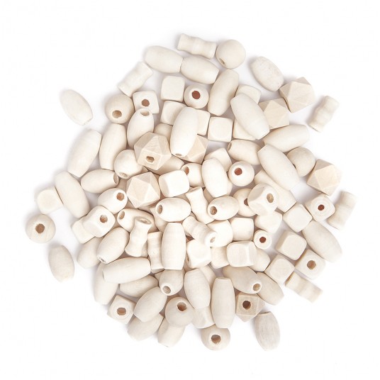 - Różnorodny zestaw drewnianych koralików w kilku rozmiarach i kształtach, m. in. kulki, wielościany, baryłki