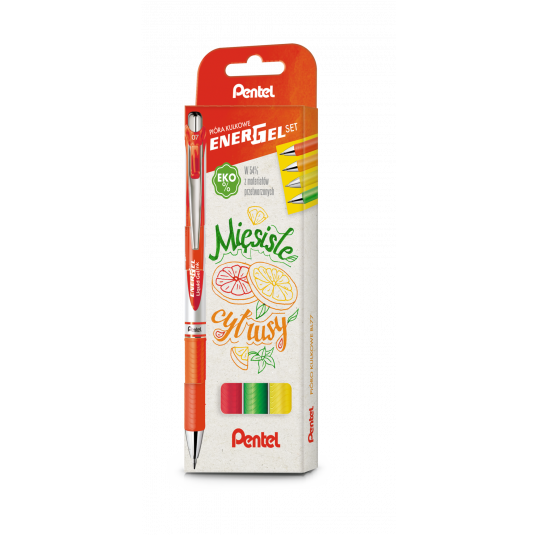 - Zestaw 4 piór kulkowych do pisania i tworzenia innowacyjnych ilustracji - EnerGel Set to kolorystyczne kompozycje z myślą o nadaniu barw Twoim notatkom - Nasze zestawy to idealny pomysł na prezent - Stworzone z myślą o osobach, które lubią mieć pod ręką intensywne kolory - MIĘSISTE CYTRUSY: czerwony, pomarańczowy, żółty, seledynowy - Rewelacyjny tusz żelowy przyczynia się do podwyższania komfortu pisania - Nie rozmazuje się i nie brudzi, wysycha błyskawicznie - Pióro idealne dla osób leworęcznych - Metalowy klip i niezawodny system przyciskowy - Wyposażone w gumowy uchwyt, który działa antypoślizgowo - Model ekologiczny, na wkłady wymienne LR7 (0,7 mm) lub LRN5 (0,5mm) - Dbając o zrównoważony rozwój nasze pióra kulkowe BL77 sąwykonane w 54% z materiałów przetworzonych pomijając części zużywające się np. wkłady