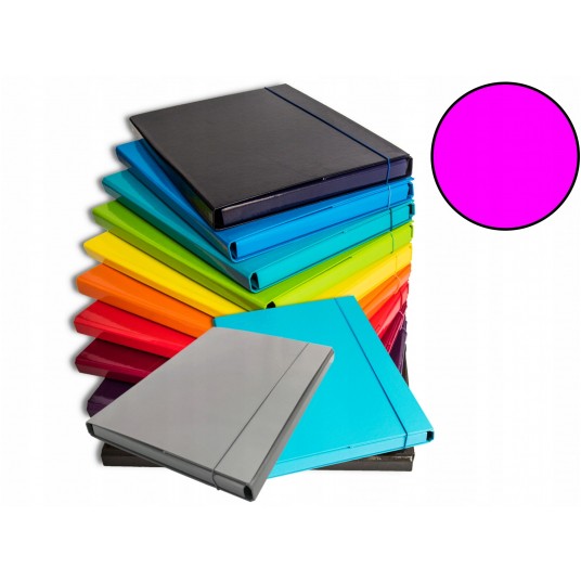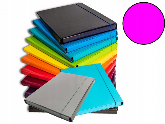 - Teczka skrzydłowa z gumką, wykonana z grubej tektury. - Powlekana folią polipropylenową z czarną wyklejką w środku. - Wyposażona w gumkę wzdłuż długiego boku. - Posiada trzy wewnętrzne klapki zabezpieczające dokumenty przed wypadnięciem. - Kolor: różowy - Format A4 - Dostępna z grzbietem 2 cm.