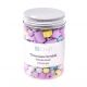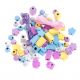 - W zestawie znajdziesz trzy kształty koralików: kwiatki, okrągłe oraz prostokątne, w pięciu pastelowych kolorach: różowym, liliowym, białym, błękitnym oraz żółtym