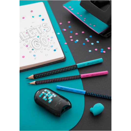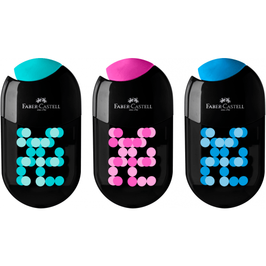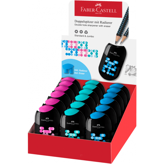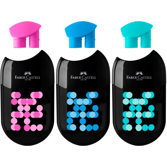 Temperówka podwójnai Two Tone z gumką FABER-CASTELL w 3 kolorach.Ergonomiczna. Idealna do klasycznych i trójkątnych kredek oraz ołówków JUMBO. Wysokiej jakości guma do ścierania, bez PCV. Atrakcyjny design. Dostępne kolory: czarno-niebieski, czarno-różowy i czarno-turkusowy.